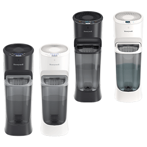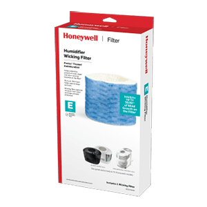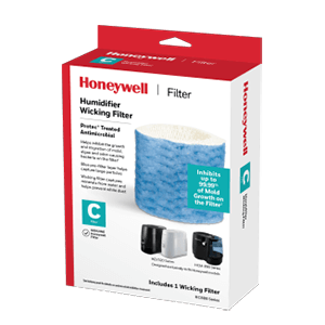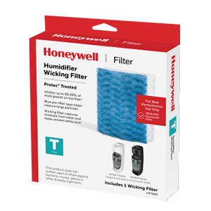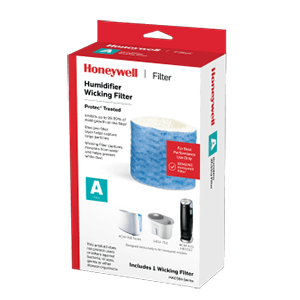 Water from the tank of your humidifier drains into the reservoir, where the wicking filter absorbs the water. A fan pulls dry air from the room through the saturated filter, helping it evaporate into the air more quickly. This creates invisible moisture output and prevents over humidification because the humidifier cannot add more moisture to the room than the air can hold. The filter captures minerals in the water to help reduce white dust and helps prevent the migration of mold, algae and bacteria. In areas with hard water, the filter may become clogged with minerals more quickly and need to be changed more frequently. Be sure to use only genuine Honeywell Replacement Filters which are Protec® antimicrobially treated.